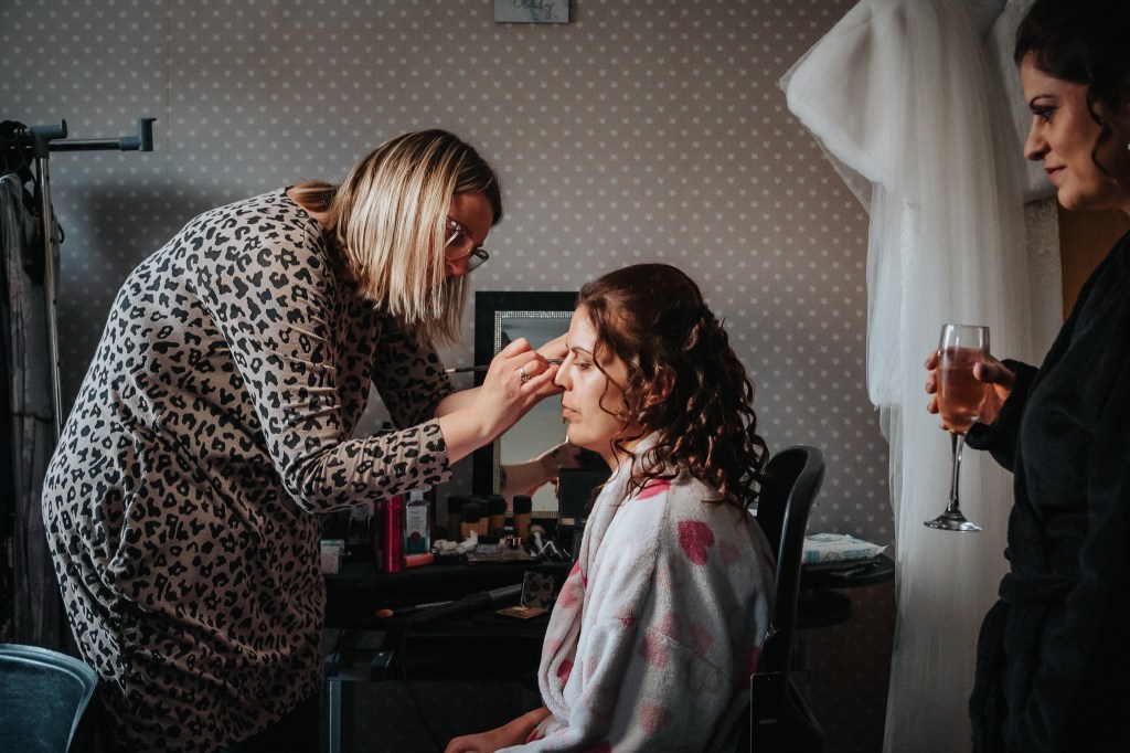 Bride(s) and bridesmaids getting their hair and makeup done
